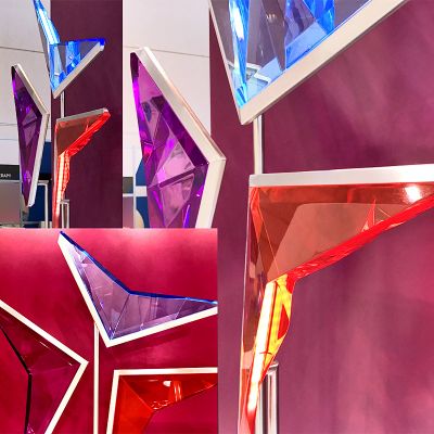 Die Flügel wurden aus hochwertigen Acrylglas-Blöcken geschnitten, facettiert und poliert. Die anschließende Einfärbung in den kundenseitig gewünschten Farbtönen erfolgte bei unserem Fertigungspartner AcryColor. Zur Vollendung für die Messepräsentation eines Pharmaunternehmens erfolgte die Montage auf gebürsteten Stäben mit Profil aus Edelstahl.