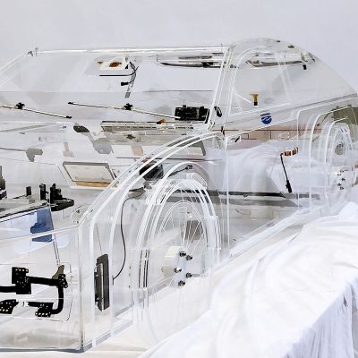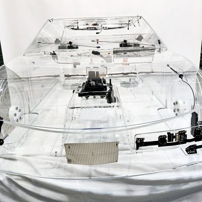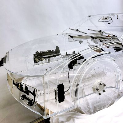 Im Auftrag eines Zulieferers der Automobilindustrie wurde eine Fahrzeugkarosse in Original-Größe komplett aus Acrylglas in unterschiedlichsten Stärken gebaut. Jedes Detail wurde in Einzelarbeit gefertigt und zu einem großen Ganzen zusammen gefügt. Dabei wurde die Konstruktion so flexibel und offen wie möglich gehalten, um in der Folge die jeweiligen Neuentwicklungen unseres Kunden insbesondere aus dem Bereich elektronischer Bauteile einbauen und präsentieren zu können. So erhalten wir die Karosse wiederholt anlässlich der internationalen Messe „Electronica München“ zurück, um die neusten Exponate wie flexible Leiterplatten, Batterien unseres Kunden für die Präsentation zu installieren.