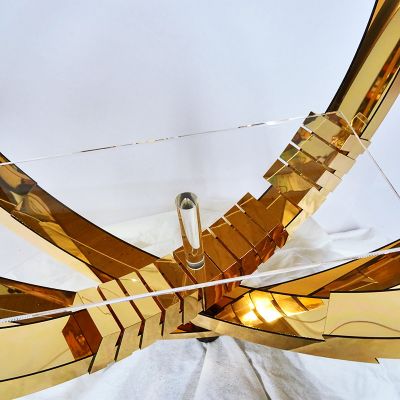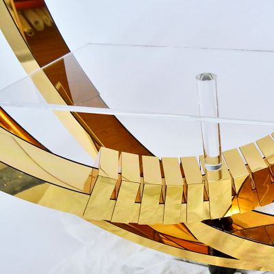 Goldfarbene Acrylglasringe sind konstruktiv über einen zentralen Punkt verbunden und drehen sich um eine Präsentationsfläche für das Exponat.