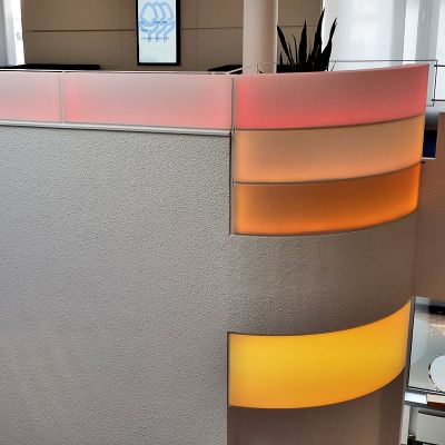Hier sollten die Räumlichkeiten einer Bank in den Diskretionsbereichen neu gestaltet werden. f + a lieferte die komplette Ausführungsplanung inkl. Herstellung von Formschablonen für jede einzelne Geometrie, die Erstellung der Unterkonstruktionen, die Montage der Acrylglaselemente einschließlich Controller gesteuerter Lichttechnik für die gewünschten Farbakzente.“