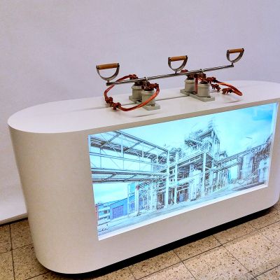 Zur Einweihung des neuen Industriegebäudes von Neolyse, GmbH Ibbenbühren wurde ein Tresen von unserem Fertigungspartner Bremthaler Möbelbau GmbH, Eppstein aus Holz gefertigt. In den Front-Ausschnitt fügten wir einen Plexiglas-Spiegel mit einem hinterdruckten Bild der neuen Industrieanlage ein. Zu dessen Hinterleuchtung wurden Lichtquellen und Batterien in den Innenraum des Tresens installiert, die über die Konstruktion eines Hebels und aufgearbeiteter antiker Schalter und Kupferkabel aktiviert wurden. Dabei war das Bild der Industrieanlage zunächst unsichtbar und wurde bei den Feierlichkeiten durch das Umlegen des großen Hebels durch die Vorstände des Unternehmens sowie den Ministerpräsidenten in Szene gesetzt. Komplette Entwicklung und Umsetzung von f+a nach einer Idee des Kunden.