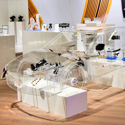 Im Auftrag eines Zulieferers der Automobilindustrie wurde eine Fahrzeugkarosse in Original-Größe komplett aus Acrylglas in unterschiedlichsten Stärken gebaut. Jedes Detail wurde in Einzelarbeit gefertigt und zu einem großen Ganzen zusammen gefügt. Dabei wurde die Konstruktion so flexibel und offen wie möglich gehalten, um in der Folge die jeweiligen Neuentwicklungen unseres Kunden insbesondere aus dem Bereich elektronischer Bauteile einbauen und präsentieren zu können. So erhalten wir die Karosse wiederholt anlässlich der internationalen Messe „Electronica München“ zurück, um die neusten Exponate wie flexible Leiterplatten, Batterien unseres Kunden für die Präsentation zu installieren.