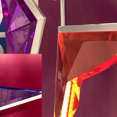 Die Flügel wurden aus hochwertigen Acrylglas-Blöcken geschnitten, facettiert und poliert. Die anschließende Einfärbung in den kundenseitig gewünschten Farbtönen erfolgte bei unserem Fertigungspartner AcryColor. Zur Vollendung für die Messepräsentation eines Pharmaunternehmens erfolgte die Montage auf gebürsteten Stäben mit Profil aus Edelstahl.