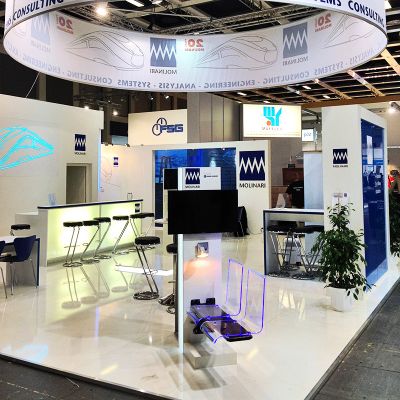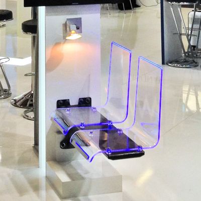 Gefertigt für einen Messestand des Schweizer Unternehmens Molinari Rail AG, in Kooperation mit dem Messebauunternehmen MC Design GmbH, Nidderau. Die Sitze der Bank erhalten durch die Einspeisung von Licht über die Kante eine edle Optik, das Material Acrylglas ist für diese Effekte prädestiniert.