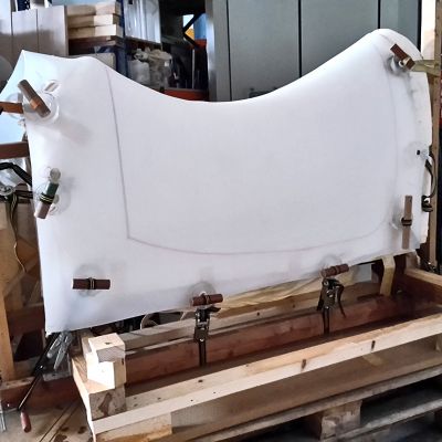 Gerade Konturen und Fräskanten aus Platten und Blöcken, im Fachchargon auch Halbzeuge genannt, fertigen und bearbeiten wir über CNC-Technik auf Vakuumtischen, mit Polierfräsen, Oberfräsen, Formatkreissägen &Co. Für Hohlkörper, Halbschalen oder gebogene Konturen muss Acrylglas jedoch thermisch verformt werden. Hierfür werden Modelle gebaut, auf deren Positivkontur das im Wärmeofen exakt erhitze Acrylglas in Sekundenschnelle aufgezogen wird, um dann im Erkaltungsprozess die gewünschte Kontur zu erlangen.